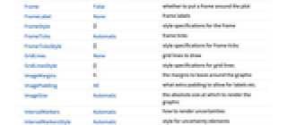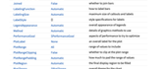 "Column" パネルの列で別々のグラフを使う "Row" パネルの行で別々のグラフを使う {"Column",k},{"Row",k} k 列(または行)を使う {"Column",UpTo[k]},{"Row",UpTo[k]} 最高で k 列(または行)を使う - ChartElementFunctionに渡される引数は,棒の範囲{{xmin,xmax},{ymin,ymax}},データ値 yi,データ集合のネストしたリストにおける各レベルからのメタデータ{m1,m2,…}である.
