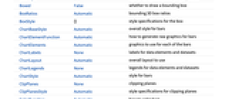 Axes True 軸を描くかどうか BarOrigin Bottom 棒の始点 BarSpacing Automatic 棒と棒の間隔 Boxed False 境界ボックスを描くかどうか ChartBaseStyle Automatic 棒の全体的なスタイル ChartElements Automatic 各棒に使うグラフィックス ChartElementFunction Automatic 棒の生のグラフィックスをどのように生成するか ChartLabels None データ要素とデータ集合のラベル ChartLayout Automatic 使用する全体的なレイアウト ChartLegends None データ要素とデータ集合の凡例 ChartStyle Automatic 棒のスタイル ColorFunction Automatic 棒の彩色方法 ColorFunctionScaling True ColorFunctionの引数を正規化するかどうか FaceGrids Automatic 境界ボックスに描く格子線 LabelingFunction Automatic 棒にどのようにラベルを付けるか LegendAppearance Automatic 凡例の全体的な外観 Lighting "Neutral" 使用する擬似光源 PerformanceGoal $PerformanceGoal パフォーマンスのどの面について最適化するか PlotInteractivity $PlotInteractivity インタラクティブ要素を許可するかどうか PlotTheme $PlotTheme グラフの全体的なテーマ ScalingFunctions None 個々の座標をどのようにスケールするか TargetUnits Automatic グラフ内に表示する単位 ViewPoint Automatic 視点 - 複数のデータ集合は,ChartLayoutの以下の設定を使って表示できる.