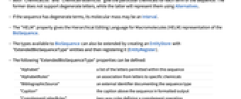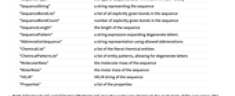 "Alphabet" この配列内で認められている文字のリスト "AlphabetRules" 文字から特定の化学物質への連想 "BibliographicSource" 配列タイプについて記述している外部識別子 "Caption" フォーマットされた出力で配列の上に付くキャプション "ComplementLetterRules" 補体操作を定義する双方向規則 "Icon" 配列のフォーマットされた出力に表示されるアイコン "MolecularMassRules" 文字から分子量への連想 - "Icon"は,画像または既存の配列タイプの正規名として与えられる.