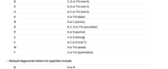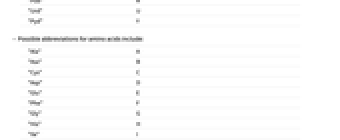B C, G または T/U(Aではない) D A, G または T/U(Cではない) H A, C または T/U(Gではない) K G または T/U(ケトン) M A または C(アミノ) N A, C, G または T/U(任意の文字) R A または G(プリン) S C または G(強) V A, C または G (Tではない) W A または T/U(弱) Y C または T/U(ピリミジン) - 次は,ペプチドに認められる縮重記号である.