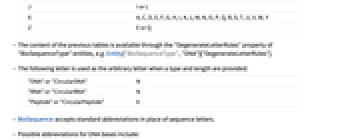 B D または N J I または L X A, C, D, E, F, G, H, I, K, L, M, N, O, P, Q, R, S, T, U, V, W, Y Z E または Q - 上記の表のコンテンツは,例えばEntity["BioSequenceType","DNA"]["DegenerateLetterRules"]のように,"BioSequenceType"実体の"DegenerateLetterRules"特性を通して得ることができる,