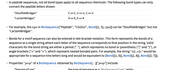 "DisulfideBridges" C ↔ C, U ↔ U, C ↔ U "LactamBridges" D ↔ K, E ↔ K - 例如,BioSequence["Peptide","CGGGU",Bond[{1,5},type]] 中的 type 可以是 "DisulfideBridges" 但不能是 "LactamBridges".