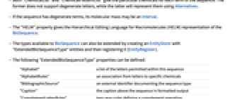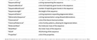 "Alphabet" 在这个序列中允许的字母列表 "AlphabetRules" 从字母指定到特定化学物的一种关联关系 "BibliographicSource" 记录序列类型的外部标识符 "Caption" 在格式化的输出中序列上方的标题 "ComplementLetterRules" 定义互补操作的双向规则 "Icon" 显示在序列的格式化输出中的图标 "MolecularMassRules" 从字母指定到分子质量的一种关联关系 - 图标 "Icon" 可以图像或现存序列类型的规范名称的形式提供.