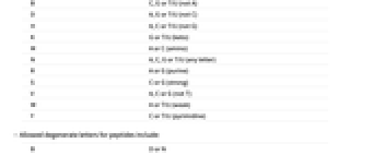 B C,G 或 T/U (非 A) D A,G 或 T/U (非 C) H A,C 或 T/U (非 G) K G 或 T/U (酮) M A 或 C (氨基) N A,C,G 或 T/U (任何字母) R A 或 G (嘌呤) S C 或 G (强) V A,C 或 G (非 T) W A 或 T/U (弱) Y C 或 T/U (嘧啶) - 允许的关于肽的退化性字母包括: