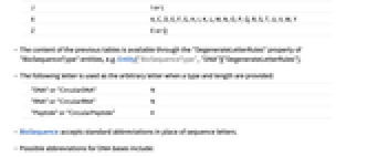 B D 或 N J I 或 L X A, C, D, E, F, G, H, I, K, L, M, N, O, P, Q, R, S, T, U, V, W, Y Z E 或 Q - 前面表格的内容可通过 "BioSequenceType" 实体的 "DegenerateLetterRules" 属性获得,例如通过 Entity["BioSequenceType","DNA"]["DegenerateLetterRules"].