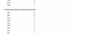 "Ala" A "Asx" B "Cys" C "Asp" D "Glu" E "Phe" F "Gly" G "His" H "Ile" I "Xle" J "Lys" K "Leu" L "Met" M "Asn" N "Pyl" O "Pro" P "Gln" Q "Arg" R "Ser" S "Thr" T "Sec" U "Val" V "Trp" W "Xaa" X "Tyr" Y "Glx" Z - 除了序列暗示的连接之外,BioSequence 字母还可以通过附加的 Bond 条目连接.
