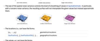 - 空間ノイズ分散のサイズはSpatialEstimateにおける値の平滑化レベルを制御する.ノイズ分散が0のときは,結果の曲面は与えられた値を補間せず,代りにそれを近似する.