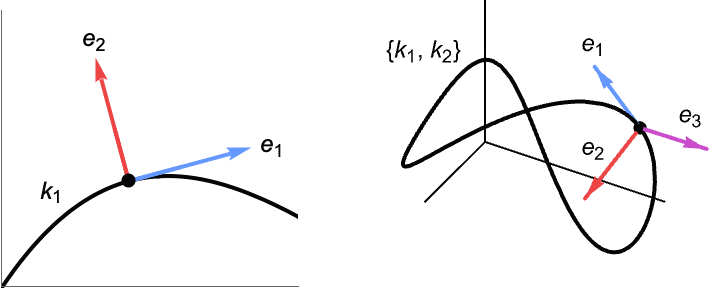 - 第1基底ベクトル e1は,曲線の単位接線である.続く各ベクトルは,直前のベクトルに正規直交する派生ベクトルである.最後のベクトルは,右正規直交基底を完成するために選ばれる.