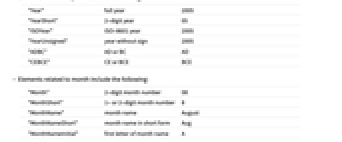"Year" 完整年份 2005 "YearShort" 两位数的年份 05 "ISOYear" ISO-8601 格式的年份 2005 "YearUnsigned" 没有符号的年份 2005 "ADBC" AD 或 BC AD "CEBCE" CE 或 BCE BCE - 与月份相关的元素包括: