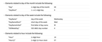 "DayName" 星期几 Wednesday "DayNameShort" 星期几的缩写 Wed "DayNameInitial" 星期几的首字母 W "ISOWeekDay" ISO-8601 表示法,一周的第几天 4 - 与小时相关的元素包括: