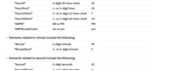 "Minute" 用 2 位数表示的分钟 05 "MinuteShort" 用 1 位数或 2 位数表示的分钟 5 - 与秒相关的元素包括: