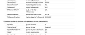 "Second" 用 2 位数表示的秒 03 "SecondShort" 用 1 位数或 2 位数表示的秒 3 "SecondExact" 包含小数的秒 03.199 "SecondFraction" 秒的小数部分 0.2 "Millisecond" 用 3 位数表示的毫秒 019 "MillisecondShort" 用 1 位数、2 位数或 3 位数表示的毫秒 19 "MillisecondExact" 包含小数的毫秒 019.99 "MillisecondFraction" 毫秒的小数部分 0.999809 - 与多个日期元素相关的元素包括: