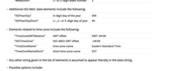 "ISOYearDay" 用 3 位数表示的年的天数 094 "ISOYearDayShort" 用 1 位数、2 位数或 3 位数表示的年的天数 94 - 与时区相关的元素包括: