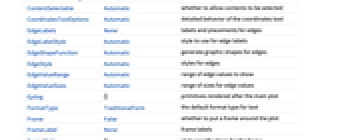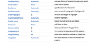 ClippingStyle Automatic 値の範囲外の辺のスタイルの決め方 ColorFunction None 辺の彩色方法の決め方 ColorFunctionScaling True ColorFunctionの引数をスケールするかどうか EdgeLabels None 辺のラベルと置き方 EdgeLabelStyle Automatic 辺ラベルのスタイル EdgeShapeFunction Automatic 辺に使うグラフィックス形状を生成する EdgeStyle Automatic 辺のスタイル EdgeValueRange Automatic 表示する辺の値の範囲 EdgeValueSizes Automatic 辺の値のサイズの範囲 GraphHighlight {} ハイライトする頂点と辺 GraphHighlightStyle Automatic ハイライトのスタイル GraphLayout Automatic 頂点と辺の配置方法 Method Automatic 使用するメソッド MinPointSeparation Automatic 近くの頂点をいつ結合するか MissingStyle None 重みがない辺の表示方法 PerformanceGoal Automatic 最適化するパフォーマンスの局面 PlotStyle Automatic スタイルを決定するグラフィックス指示子 PlotTheme Automatic グラフの全体的なテーマ ScalingFunctions None 値のスケールの仕方 TargetUnits Automatic 値に使用する単位 VertexCoordinates Automatic 頂点の座標 VertexLabels None 頂点のラベルと置き方 VertexLabelStyle Automatic 頂点ラベルのスタイル VertexShape Automatic 頂点のグラフィックス形状 VertexShapeFunction Automatic 頂点のグラフィックス形状を生成する VertexSize Automatic 頂点サイズ VertexStyle Automatic 頂点のスタイル - EdgeValueRangeはプロットに含める辺フローの範囲を指定する.