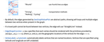 Automatic 辺を自動計算する "StraightLine" 辺に直線を使う "Geodesic" 測地線を辺として使う "Rhumb" 航程線を辺として使う "Driving","Walking","Cycling" 移動手段 - デフォルトで,GeoGraphValuePlotが生成する辺は,2つの頂点間に自己ループや多重辺がグラフの中にあればそれが表示された抽象経路である.