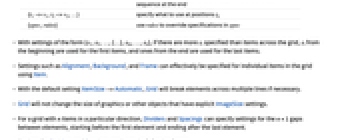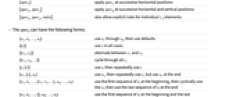 {s1,s2,…,sn} まず s1から snまでを使い,次いでデフォルトを使う {{c}} すべての場合に c を使う {{c1,c2}} c1と c2を交互に使う {{c1,c2,…}} すべての ciを循環させる {s,{c}} まず s を使い,続いて c を繰り返し使う {s1,{c},sn} まず siを使い,続いて c を繰り返し使うが,最後には snを使う {s1,s2,…,{c1,c2,…},sm,…,sn} まず siの最初の連続を使い,続いて ciを循環的に使い,それから siの最後の連続を使う {s1,s2,…,{},sm,…,sn} 最初に siの最初の連続を使い,最後の連続を最後に使う {i1->v1,i2->v2,…} 位置 ikで何を使うかを指定する {spec,rules} rules を使って specの指定を無効にする - {s1,s2,…,{…},sm,…,sn}という形の設定では,格子中の項目数以上の siが指定されている場合は,始まりの方の siは始まりの方の項目に使われ,終りの方の siは終りの方の項目に使われる.