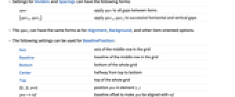 Axis 格子中の中央行の軸 Baseline 格子中の中央行のベースライン Bottom 格子全体の一番下 Center 上と下の中間 Top 格子全体の一番上 {{i,j},pos} 要素 i,j 中の位置 pos pos->ref pos が ref と並ぶようにするベースラインオフセット - BaselinePositionはデフォルトでCenter->Axisであるとみなされる.