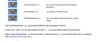 {"SaltPepperNoise",f} 对图像 f 添加椒盐噪声的比例 - 用 {"SaltPepperNoise",{fs,fp}} 指定不同的椒和盐的比例.