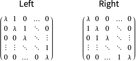 is UnitVector[n,i]. JordanDecomposition returns a block Jordan matrix of this form. » - JordanMatrix[λ,n,dir] uses dir to determine the resulting matrix layout. It must be one of Left (the default) or Right. This directive determines whether the diagonal elements are to the left or right respective to the 1s. »