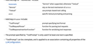Automatic "Service" when supported, otherwise "Textual" "Service" 依靠 service 的工具机制 "Textual" 使用基于提示的工具调用 assoc 特定文本提示和解析  - assoc 中有效的键包括: