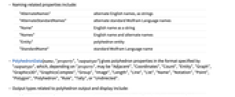 "Polyhedra" 复合多面体组成部分 "Polyhedron" Polyhedron 表达式 "Polygons" 对应于面的多边形列表 "Lines" 对应于边的线列表 "Points" 对应于顶点的点列表  - 图形属性包括: