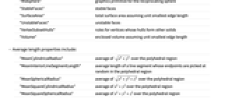 "Centroid" 标准嵌入图形的几何中心的坐标 "Circumcenter" 内切球中心 "Circumdiameter" 外接圆半径的两倍 "Circumradius" 外接圆半径,假设单位长度的最小边 "Circumsphere" 内切球的图元 "DehnInvariant" Dehn 不变量 "DihedralAngles" 二面角 "GeneralizedDiameter" 一对顶点的最大长度 "Incenter" 内切球中心 "InertiaTensor" 假定为单位质量的实多面体的惯性张量 "Inradius" 内径,假设单位长度的最小边 "Insphere" 内切球 "Midcenter" 摆动球体的中心 "Midradius" 半径,假设单位长度的最小边 "Midsphere" 摆动球的图元 "StableFaces" 稳定的面 "SurfaceArea" 表面区域总合,假设单位长度的最小边 "UnstableFaces" 不稳定的面 "VertexSubsetHulls" 外壳形成其它立体图形顶点的规则 "Volume" 围绕的体积,假设单位长度的最小边  - 平均长度属性包括: