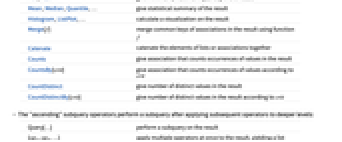Total 结果中所有数值的总和 Min,Max 给出结果中的最小和最大值 Mean,Median,Quantile,… 给出结果的统计摘要信息 Histogram,ListPlot,… 计算结果的绘图信息 Merge[f] 用函数 f 将结果中有共同键的关联归并在一起 Catenate 将列表或关联中的元素串接在一起 Counts 给出计算结果中数值出现的次数的关联 CountsBy[crit] 给出根据 crit 计算结果中数值出现的次数的关联 CountDistinct 给出结果中不同值的个数 CountDistinctBy[crit] 给出根据 crit 结果中不同值的个数  - 在后面的运算符应用到更深一层之后,“退出”子查询运算符进行子查询操作: