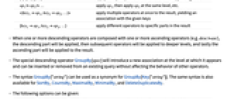 Query[…] 对结果进行子查询 {op1,op2,…} 对结果一次运用多个运算符,产生一个列表 op1/* op2/* … 在同一层运用 op1,然后运用 op2,依次类推 <|key1op1,key2op2,…|> 对结果一次运用多个运算符,用给定键产生关联 {key1op1,key2op2,…} 对结果中指定元素运用不同的运算符  - 当一个或多个深入运算符和一个或多个退出运算符(例如:desc/*asc)组合在一起时,先运用深入运算符,接着其后跟随的运算符作用到更深层次的数据上,最后退出运算符将对结果进行操作.