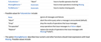 None 忽略所有提示信息及失败操作 "Abort" 当遇到提示信息时终止整个查询(缺省) "Drop" 丢弃发出信息的操作所产生的结果 "Encapsulate" 将发出信息的操作封装在 Failure 对象中 "Replace" 用 Missing["Failed"] 代替发出信息的操作产生的结果  - 选项 MissingBehavior 规定了数值函数和其他函数应该怎样处理头为 Missing 的表达式. 可能的值包括: