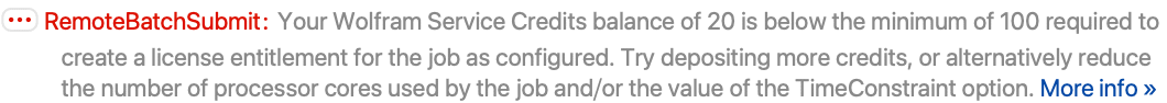 Using the default on-demand licensing settings, RemoteBatchSubmit will refuse to submit a job if your Service Credits balance is insufficient to create a license entitlement based on the job processor count and TimeConstraint: