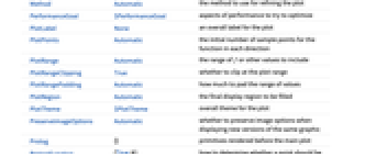 AspectRatio 1 高宽比 BoundaryStyle None 如何绘制 RegionFunction 边界 BoxRatios Automatic 有效三维有界框比率 ClippingStyle None 如何绘制由 PlotRange 剪切的值 ColorFunction Automatic 如何对图线进行着色 ColorFunctionScaling True 是否对 ColorFunction 的变量进行尺度缩放 Frame True 是否在图线周围绘制边框 FrameTicks Automatic 边框刻度记号 LightingAngle None 模拟光源的有效角度 MaxRecursion Automatic 所允许的最大递归子划分数目 Mesh None 绘制多少条网格线 MeshFunctions {#3&} 怎样确定网格线的放置 MeshShading Automatic 如何绘制网格线之间的阴影区域 MeshStyle Automatic 网格线的样式 Method Automatic 修改图线所使用的方法 PerformanceGoal $PerformanceGoal 尝试优化哪些方面的性能 PlotPoints Automatic 在每个方向上函数的样本点的初始数目 PlotRange Automatic 要包括的 f 或其它值的范围 PlotRangeClipping True 是否在图形范围进行剪切 PlotRangePadding Automatic 在值的范围上所需的填充量 PlotTheme $PlotTheme 图线的整体主题 RegionFunction (True&) 如何确定是否应该包括一个点 ScalingFunctions None 如何对单个坐标进行尺度缩放 WorkingPrecision MachinePrecision 用于内部计算的精度 - ColorFunction 被提供了单个变量,默认情况下由 f 的尺度缩放后的值给出,该值可以是分布的 PDF、CDF 等.