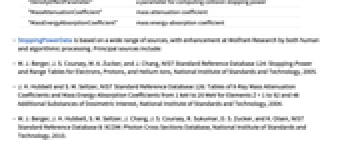 - J. H. Hubbell and S. M. Seltzer, NIST Standard Reference Database 126: Tables of X-Ray Mass Attenuation Coefficients and Mass Energy-Absorption Coefficients from 1 keV to 20 MeV for Elements Z = 1 to 92 and 48 Additional Substances of Dosimetric Interest, National Institute of Standards and Technology, 2004.