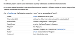 Tree[<|"Player"playerj|>,{actiont1,…,actiontk}] 动作节点,其中 playerj 有 m 个可能的动作 actionj Tree[<|"Payoffs"{payoff1,…,payoffn}|>,{}] 终端节点,带有 n 个玩家的收益 payoffk - 动作节点和终端节点的附加信息包括引用传入边的动作标签和动作概率: