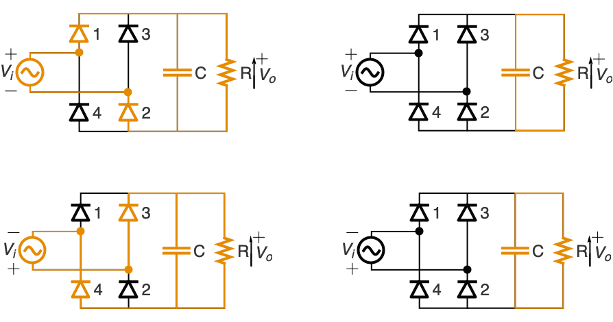 对由四个二极管和一个电容构成的 AC-to-DC 全波整流器建模,用于平滑输出:
