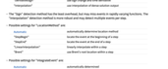 "DetectionMethod" Automatic 用于检测事件的方法 "LocationMethod" Automatic 用于在时间步骤中定位事件的方法 "IntegrateEvent" Automatic 是否积分事件函数 "Priority" Automatic 作用于同时发生事件的优先级 - "DetectionMethod" 可能的设置为: