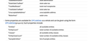 "Entities" 使用可能なすべての実体 "EntityCount" 使用可能な実体の総数 "Classes" 使用可能なすべての実体クラス "EntityClassCount" 使用可能な実体クラスの総数 "SampleEntities" サンプル実体のリスト "SampleEntityClasses" サンプル実体クラスのリスト "EntityCanonicalNames" すべての実体の正規名のリスト "PropertyCanonicalNames" すべての特性の正規名のリスト "EntityClassCanonicalNames" すべての実体クラスの正規名のリスト "RandomEntities" 擬似ランダムサンプル実体 {"RandomEntities",n} n 個の擬似ランダム実体 "RandomEntityClasses" 擬似ランダムサンプル実体のクラス {"RandomEntityClasses",n} n 個の擬似ランダム実体クラス - 次の注釈をZIPCodeData[entity,property,annotation]の第3引数として使うことができる.