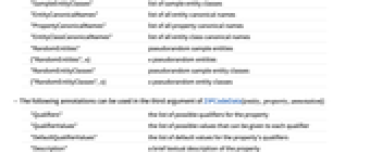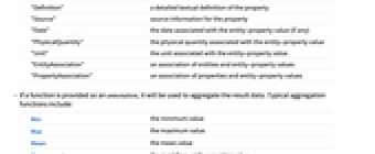 "Qualifiers" 特性の可能な限定子のリスト "QualifierValues" 各限定子に与えることができる値のリスト "DefaultQualifierValues" 特性の限定子のデフォルト値のリスト "Description" 特性のテキストによる簡単な説明 "Definition" 特性のテキストによる詳細な定義 "Source" 特性の出典情報 "Date" 実体と特性のペアの値があれば,それに関連した日付 "PhysicalQuantity" 実体と特性のペアの値に関連した物理量 "Unit" 実体と特性のペアの値に関連した単位 "EntityAssociation" 実体および実体と特性のペアの値の連想 "PropertyAssociation" 特性および実体と特性のペアの値の連想 - 関数が annotation として与えられている場合,これは結果のデータを集約するのに使われる.次はよく使われる集約関数である.