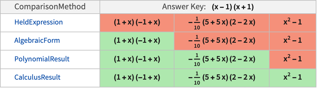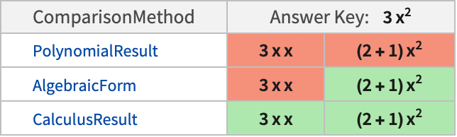 All (デフォルト) 数値的に等しい任意の係数は正解とマークされる "Sign" –1の同等な配置は正解とマークされる None 係数と符号は解答集と厳密に一致しなければならない - 次の表は,一般的な解答集の解と提出された可能性のあるいくつかの解答について,"PolynomialResult"と他の比較方法との比較を示している.
